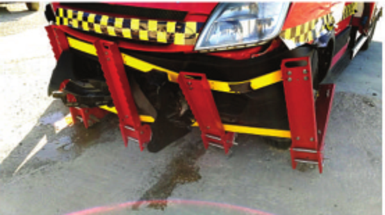 Las ruedas traseras se accionan mediante una palanca que permite levantar muy rápidamente una sección de 5 unidades, el ancho necesario para permitir el paso de los vehículos de emergencia.